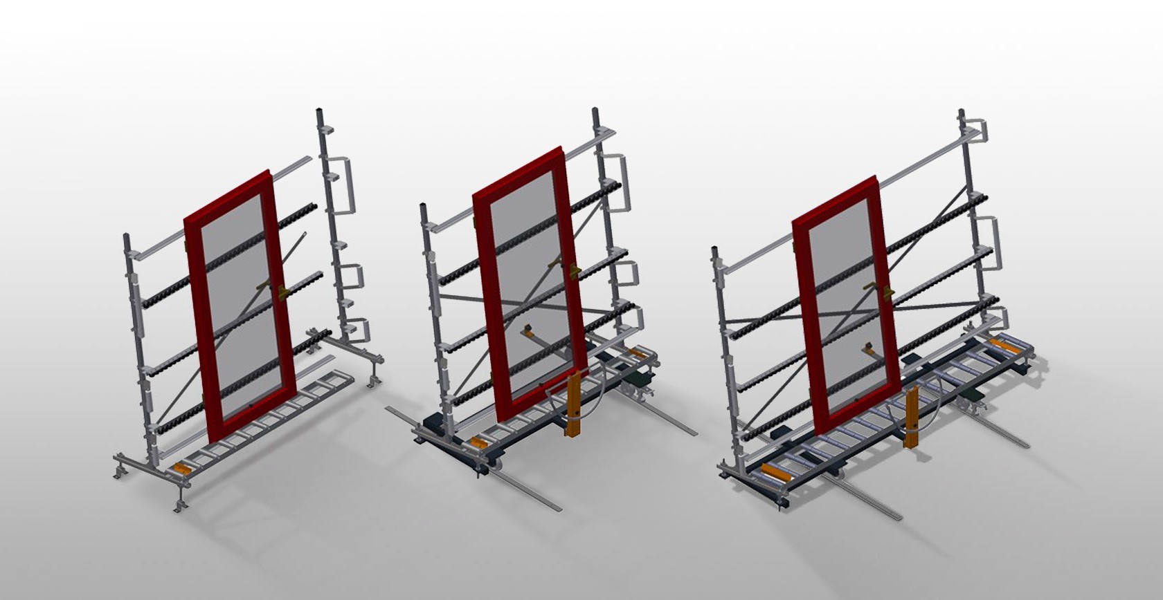 VR 3000 DF / VR 4000 DF / VR 3003 DF / VR 4003 DF: Cada unidade de transportadora de rolos 3.000/4.000 mm de comprimento (conforme o modelo). Perfis corrediças em plástico superior e inferior. Três transportadoras de roletes com rolos de borracha, diâmetro de 50 mm. Unidade base com suporte terminal. Transportadora vertical de rolos sobre carrilhos, móvel com rodas de friso. Transportadora de rolos, girável por 360°.