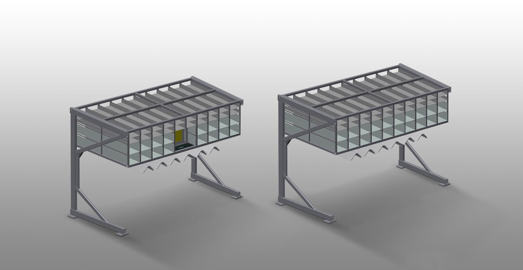 Hardware rack with 36/40 compartments for orderly hardware storage at the sash assembly station. Stable steel construction. With six angled supports for corner linkage gears.